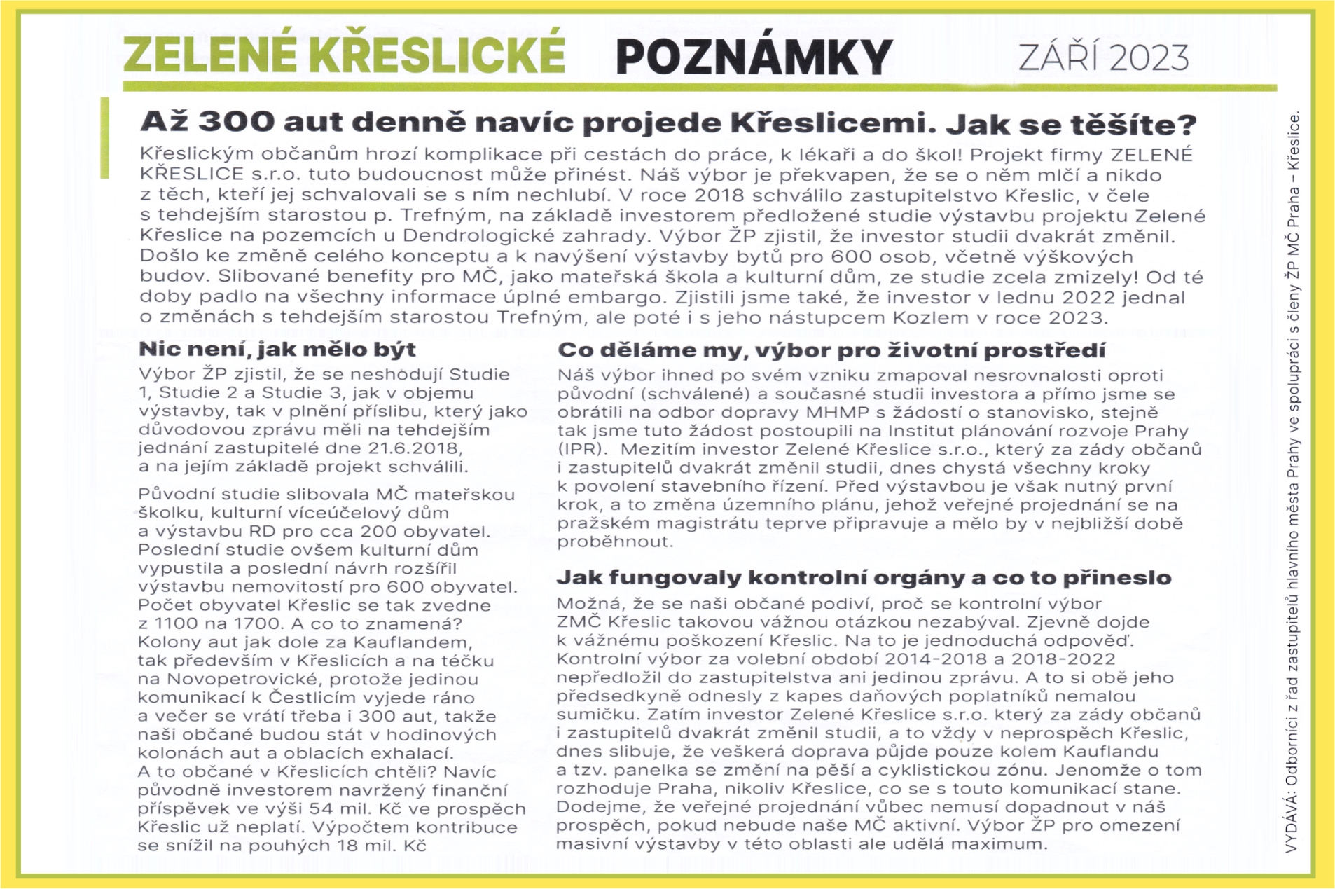 Zastupitel Rudolf Mládek v roce 2023 ve svém článku v letáku “Zelené křeslické poznámky” (viz níže) správně a otevřeně konstatoval, že projekt ZELENÉ KŘESLICE je problematický a pro městskou část představuje vážné riziko. Doslova uvedl, že „zjevně dojde k vážnému poškození Křeslic”. Jeho tehdejší kritika vycházela z konkrétních dopadů projektu na dopravu, životní prostředí i kvalitu života místních obyvatel.